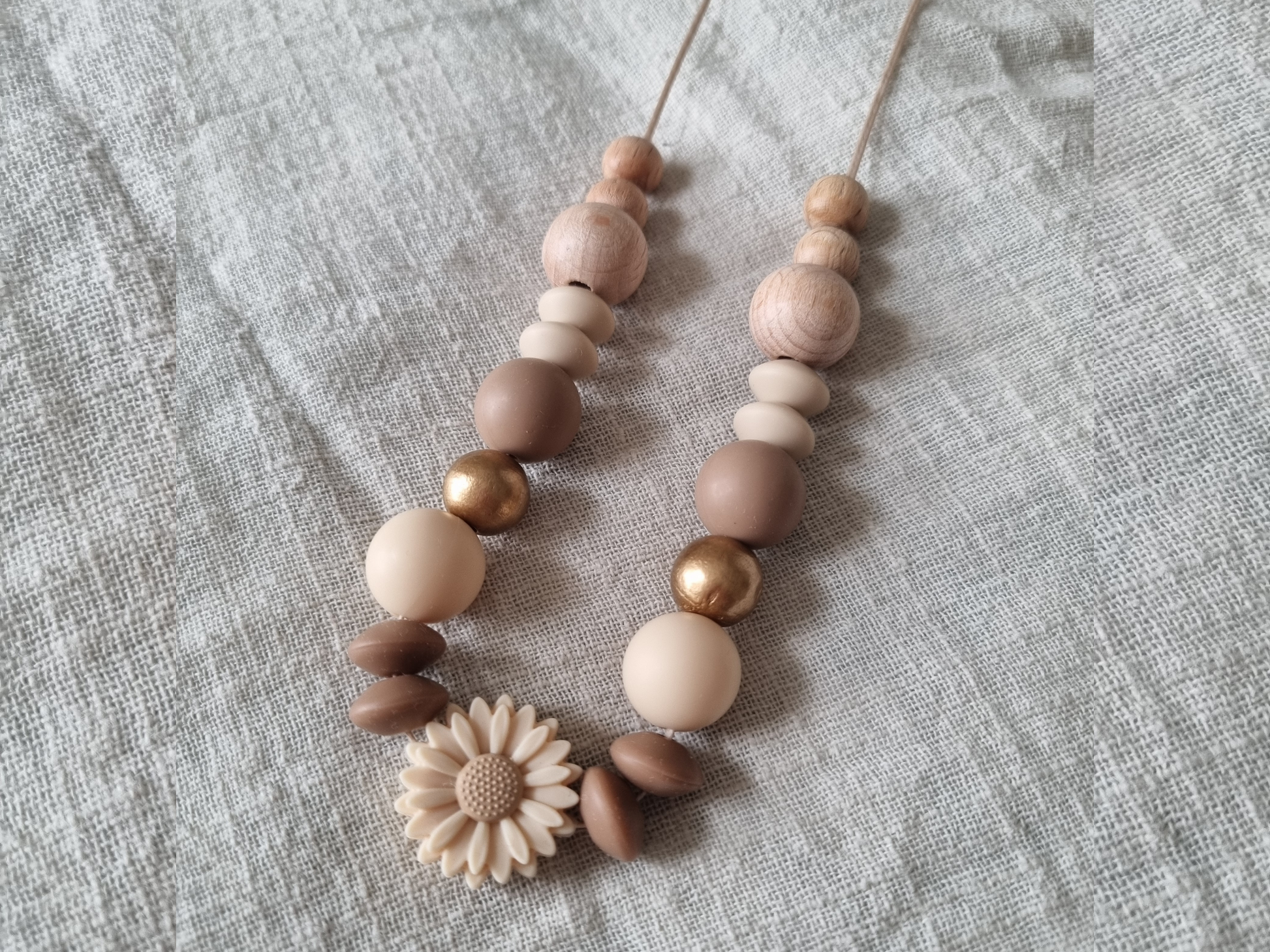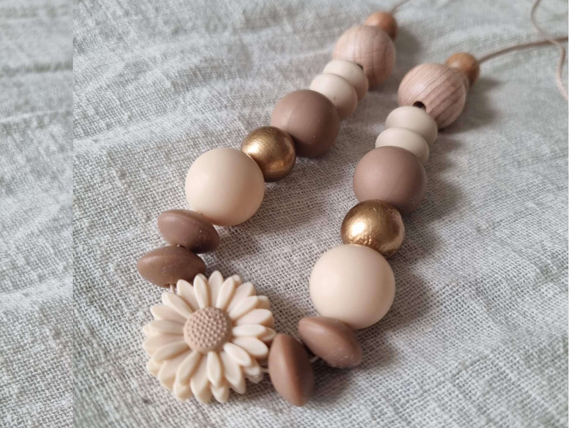 This necklace is made from wood and silicon beads. The silicon beads are made from food grade silicon, toxic free and don't contain BPA.