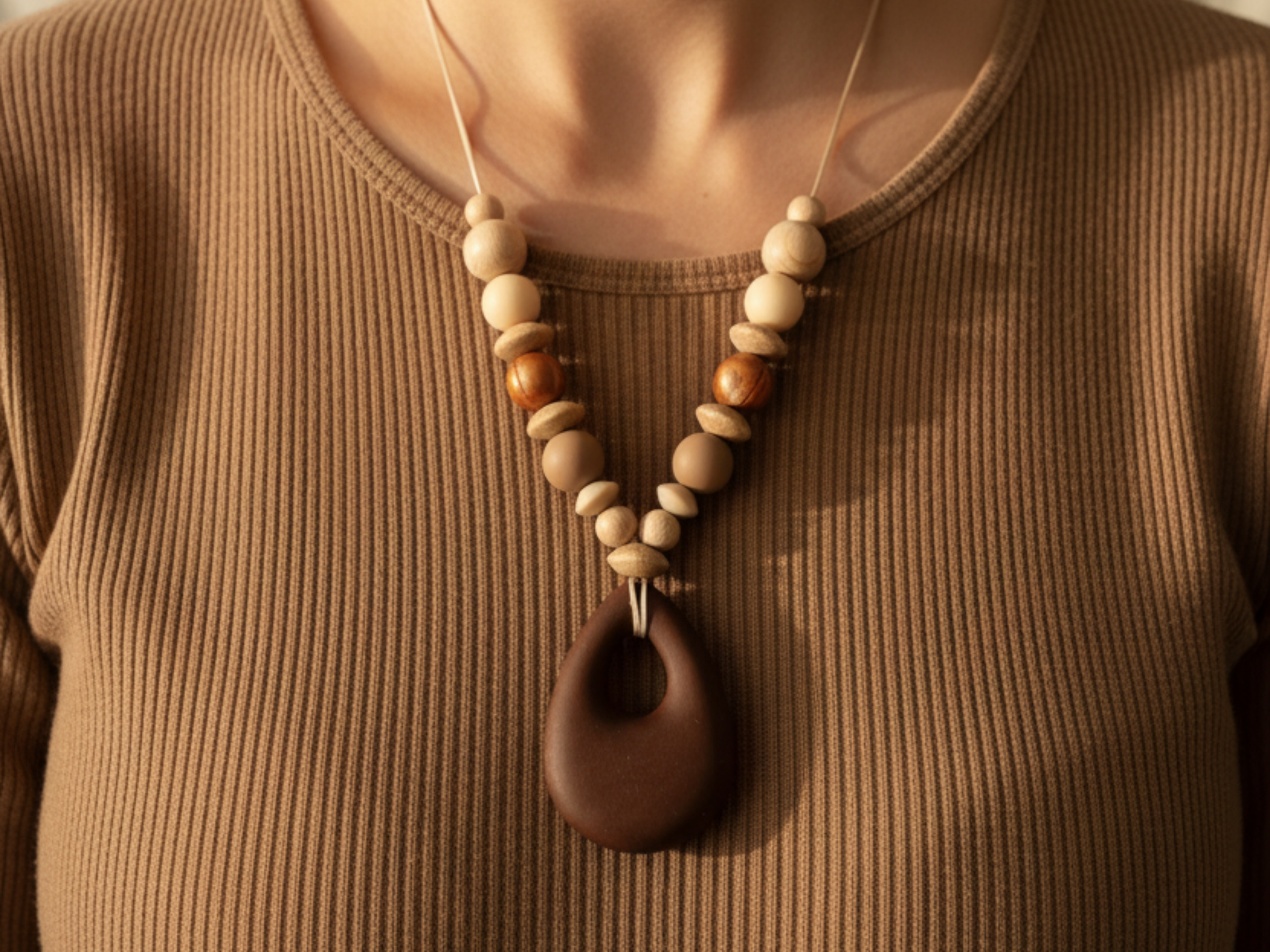 This necklace is made from wood and silicon beads. The silicon beads are made from food grade silicon, toxic free and don't contain BPA.