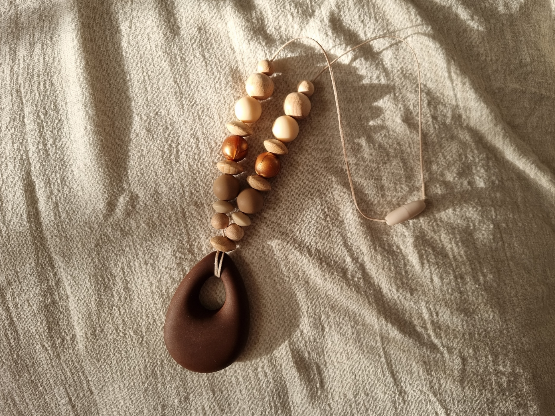 Brown Silicon and wood nursing necklace with brown tear shaped pendant and copper silicon beads