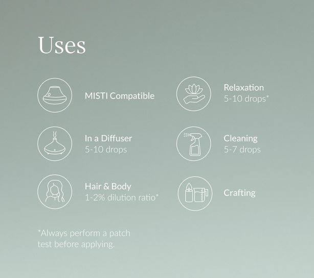 This oil is often used to freshin indoors for mental clarity, giving you energy, helping with resptory congestion. Eucalyptus is used for pain relief as it has anti-inflamatory properties and reduces headaches, managing discomfort.